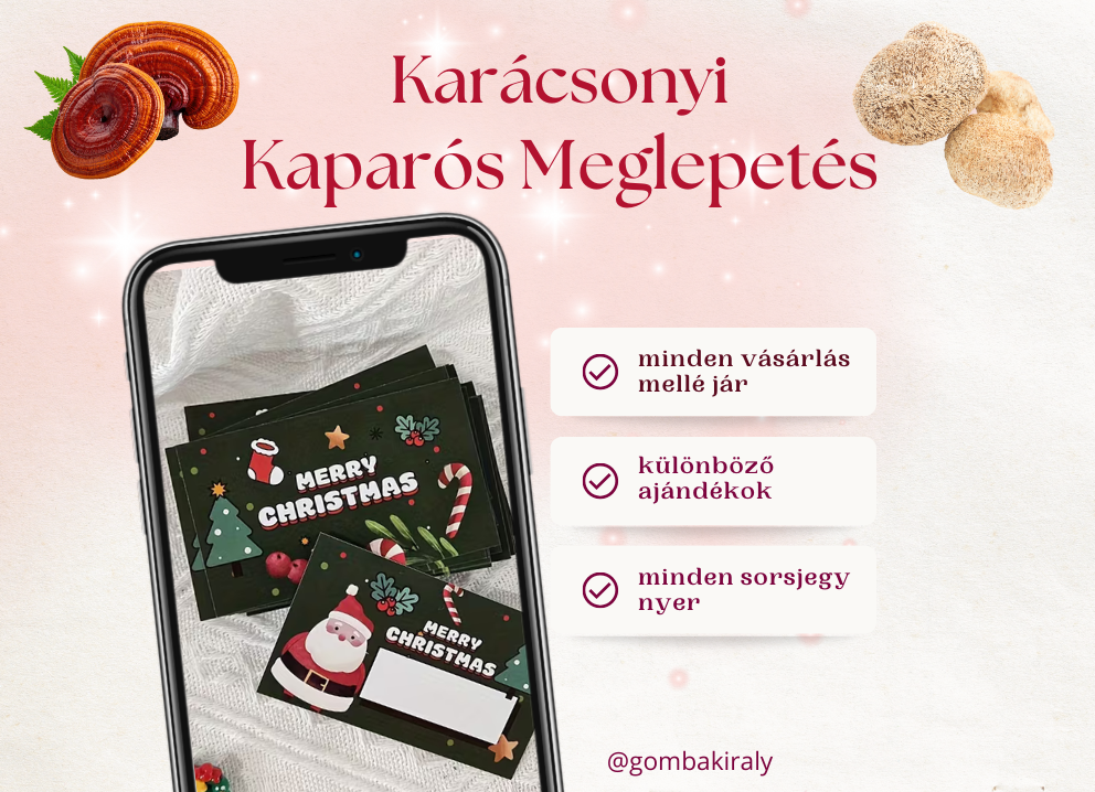 Megérkezett a Gombakirály Karácsonyi Kaparós! 🎁 Decemberben minden rendelés mellé karácsonyi kaparós sorsjegyet adunk ajándékba – és minden sorsjegy nyer! 🥳
